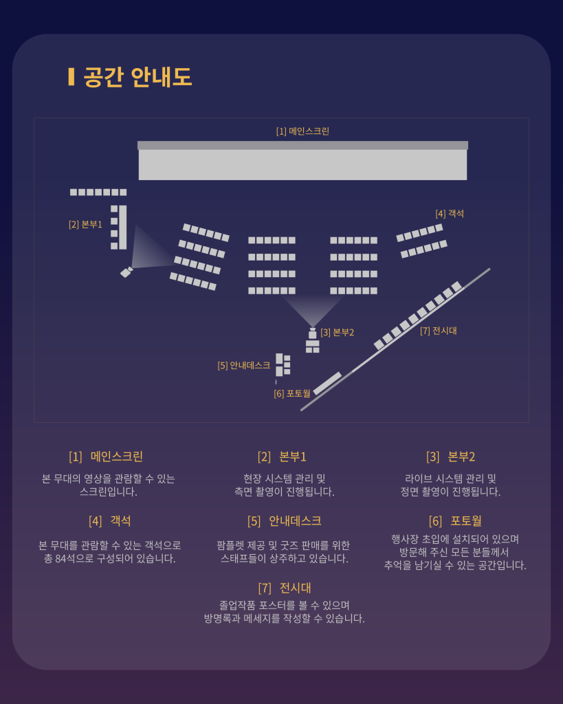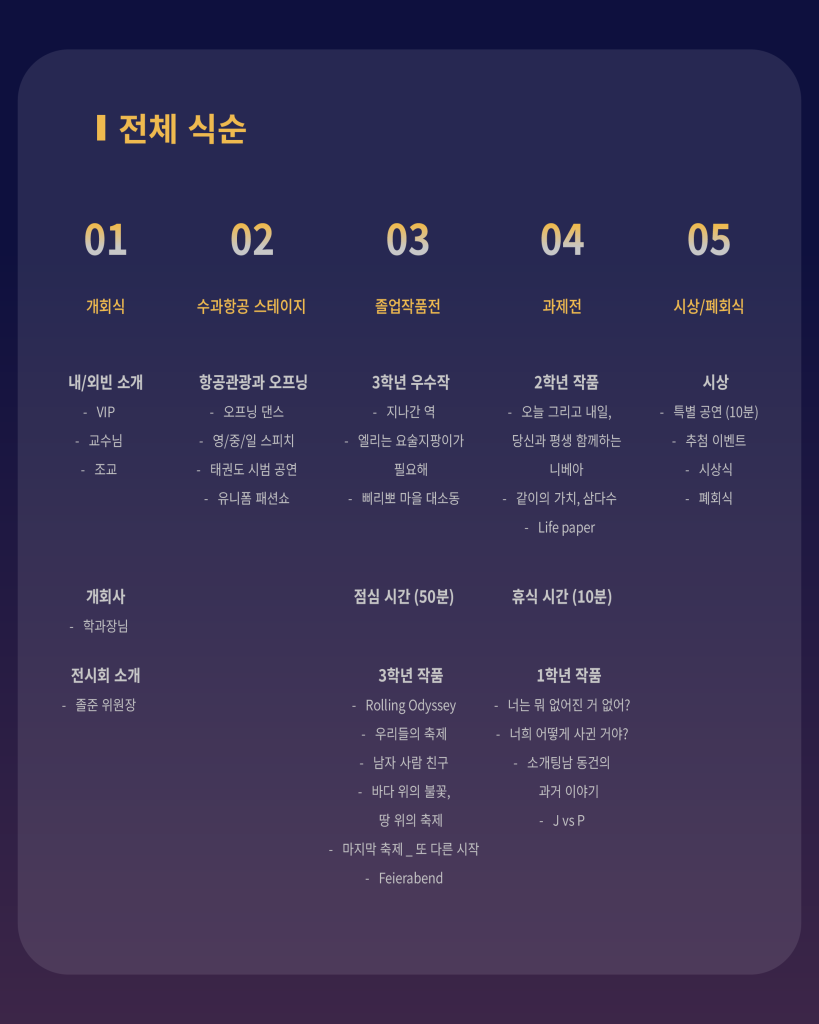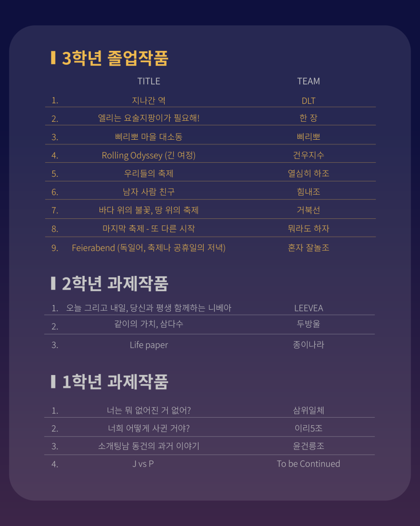2025년은 졸업작품전시회가 3회차에 들고 있습니다. 지난 두번의 졸업작품전시회에서 이미 교내외의 많은 찬사를 받았습니다만, 외적인 칭찬과 찬사는 잠시 접어두고, 지금. 그리고 지난 3년간 매일, 매일이 창작의 고통과 함께 가슴설레는 작업일이었던, 우리 학생들 자신을 위한 작은 축제를 열고자 합니다. 이 소중한 축제는 우리 구성원들이 앞으로 서로 돌보고 가꾸도록 하여, 30년 이상 성장 발전 할 수 있기를 기대해 봅니다.