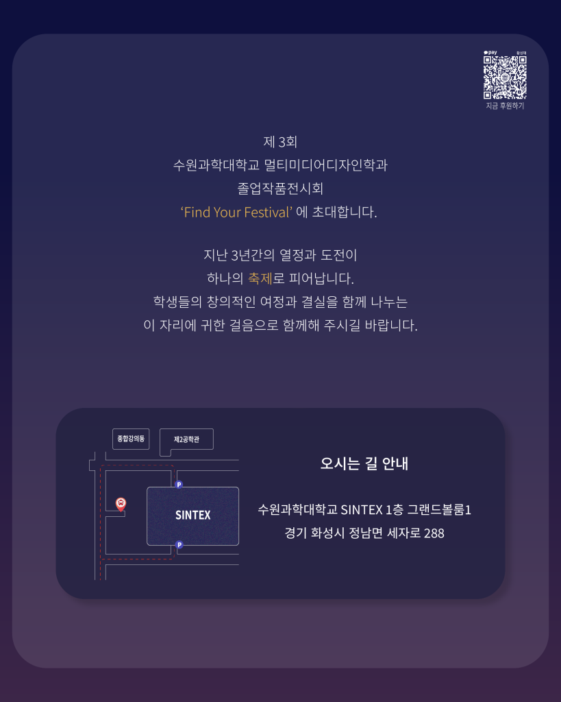 멀티미디어디자인학과를 사랑해 주시는 모든 여러분께 고합니다. 우리 학생들은 이제 더이상 여리기만 한 막내 도우미가 아닌, 여엿한 감독으로, PD로, 디자이너로 거듭나고자 합니다. 우리 학생들의 작품을 같이 즐기러, 현장으로, 온라인 극장으로 오셔서 관람해 주세요. 당신을 초대합니다. 학부모님들과 졸업생, 산업체전문가 여러분들도 이자리에 꼭 모시고자 하오니 참석을 부탁드립니다. 이번 졸업작품의 주제는 ‘축제’ 입니다. 재미있게 감상해 주세요.